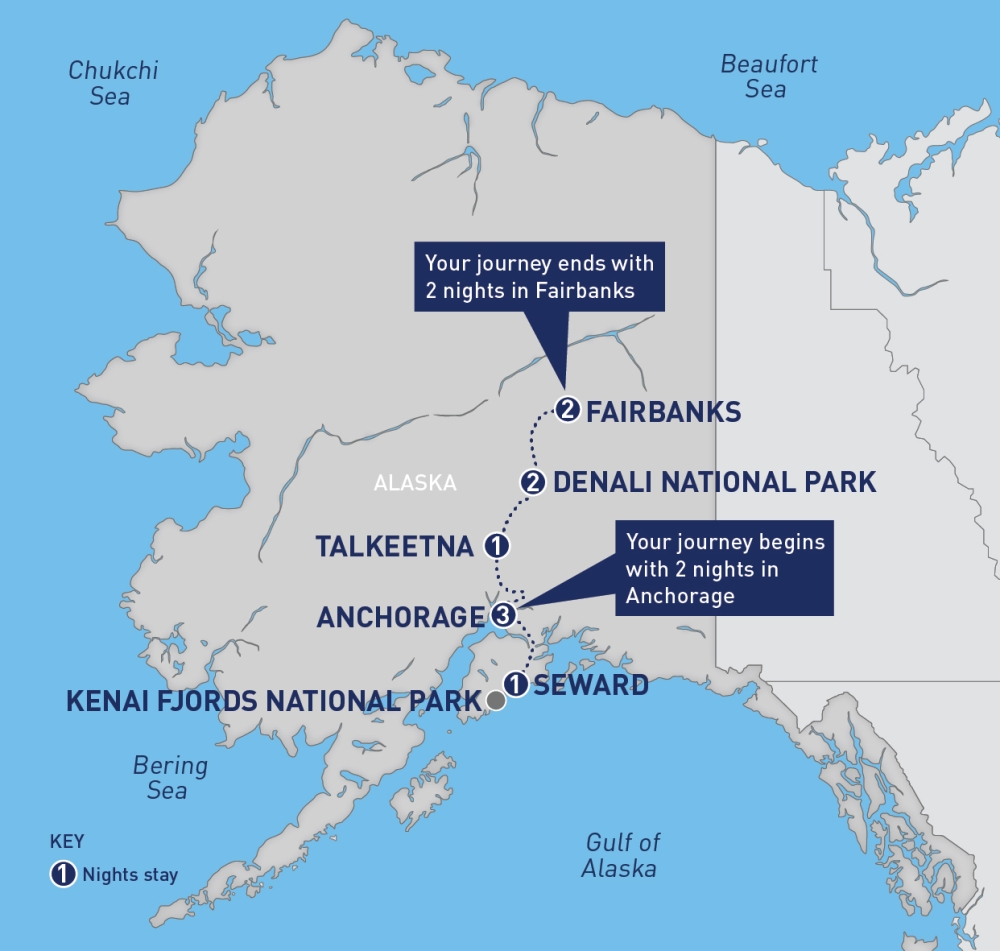Anchorage, AK → Seward, AK → Kenai Fjords National Park → Talkeetna, AK → Denali National Park, AK → Fairbanks, AK